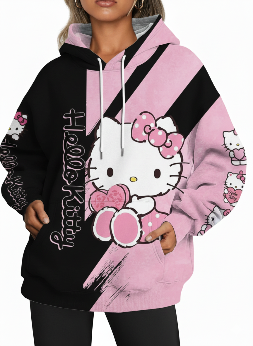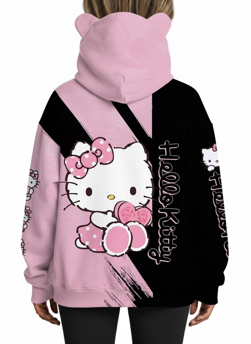 Make a bold statement with this eye-catching and playful Hello Kitty Hoodie pullover hoodie! This unique design features an appealing pink and black split graphic pattern with a large, adorable Hello Kitty holding a heart, showcasing a modern, vibrant aesthetic. The absolute highlight is the hood with attached cat ears, perfect for fans who love an extra touch of cuteness and fun.