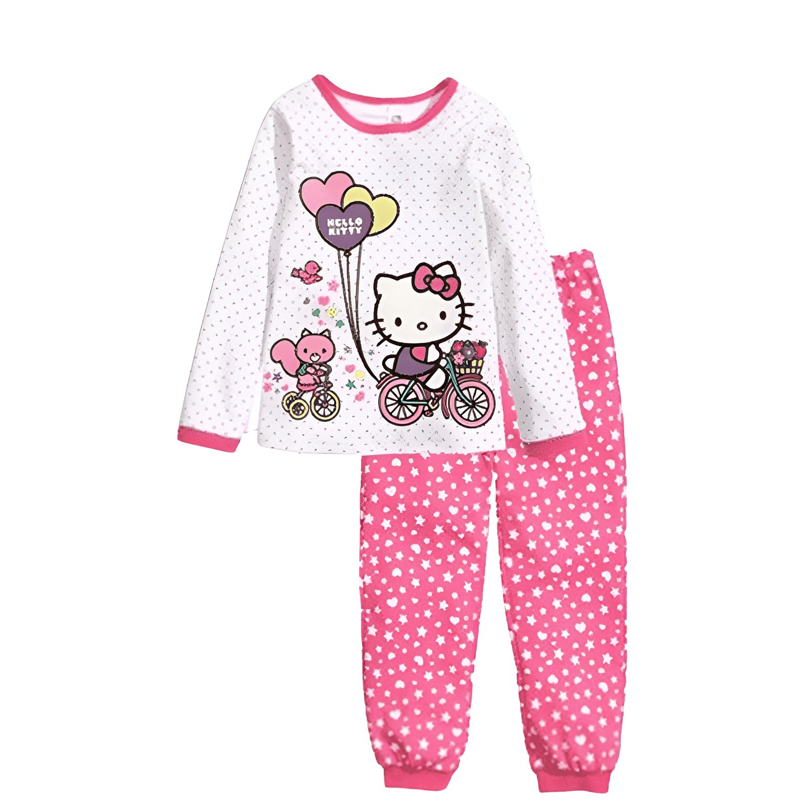 Designed for comfort and charm, this two-piece sleepwear set is perfect for young Hello Kitty fans. The white, long-sleeve top features a cute, high-quality graphic of Hello Kitty riding a bicycle with balloons and her squirrel friend, set against a subtle polka-dot background. The coordinating pink pajama bottoms are covered in a playful star print and include elasticated cuffs for a snug and secure fit throughout the night. Made from soft, breathable fabric, this set ensures your little one stays cozy and comfortable while dreaming of adventures with her favorite cat. Give the gift of comfort and style with this must-have addition to any girl’s sleepwear collection.