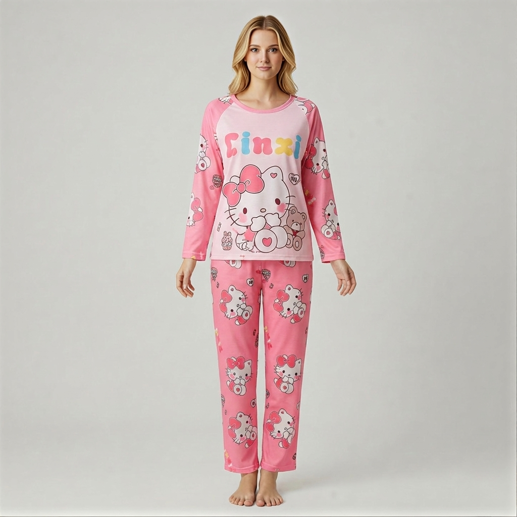 Make bedtime fun with the vibrant Hello Kitty Pajama Set! This cheerful two-piece set features a comfy long-sleeve top with raglan sleeves and a large, adorable graphic of Hello Kitty hugging teddy bears. The soft pink hue is complemented by matching full-length pants covered in a delightful, repeating pattern of Hello Kitty and bows. Made from a lightweight, soft cotton blend, this sleepwear ensures a breathable and relaxed fit, making it perfect for year-round comfort. It’s the ideal gift for any young fan of the classic Sanrio character.