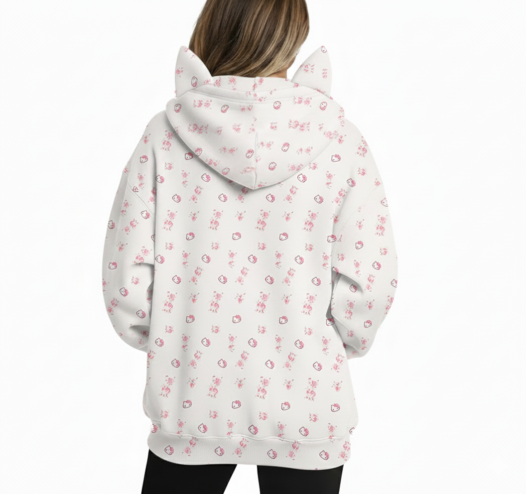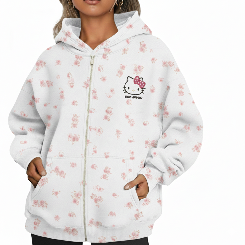 Elevate your casual wardrobe with this ultra-cute Hello Kitty Hoodie zip-up hoodie. Perfect for layering, this white hoodie features a charming all-over cartoon pattern of Hello Kitty heads and small floral accents in soft pink and black. It’s the ultimate piece for fans who love a touch of pastel cuteness.