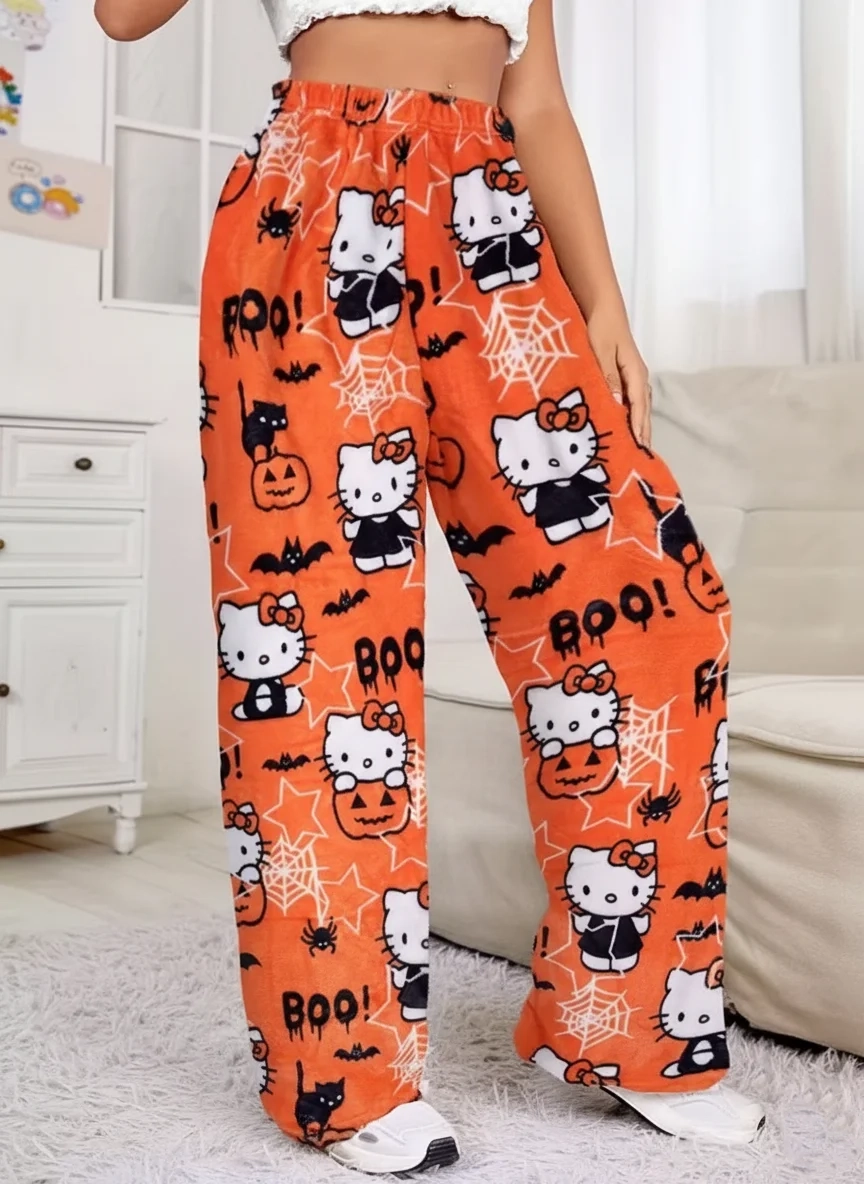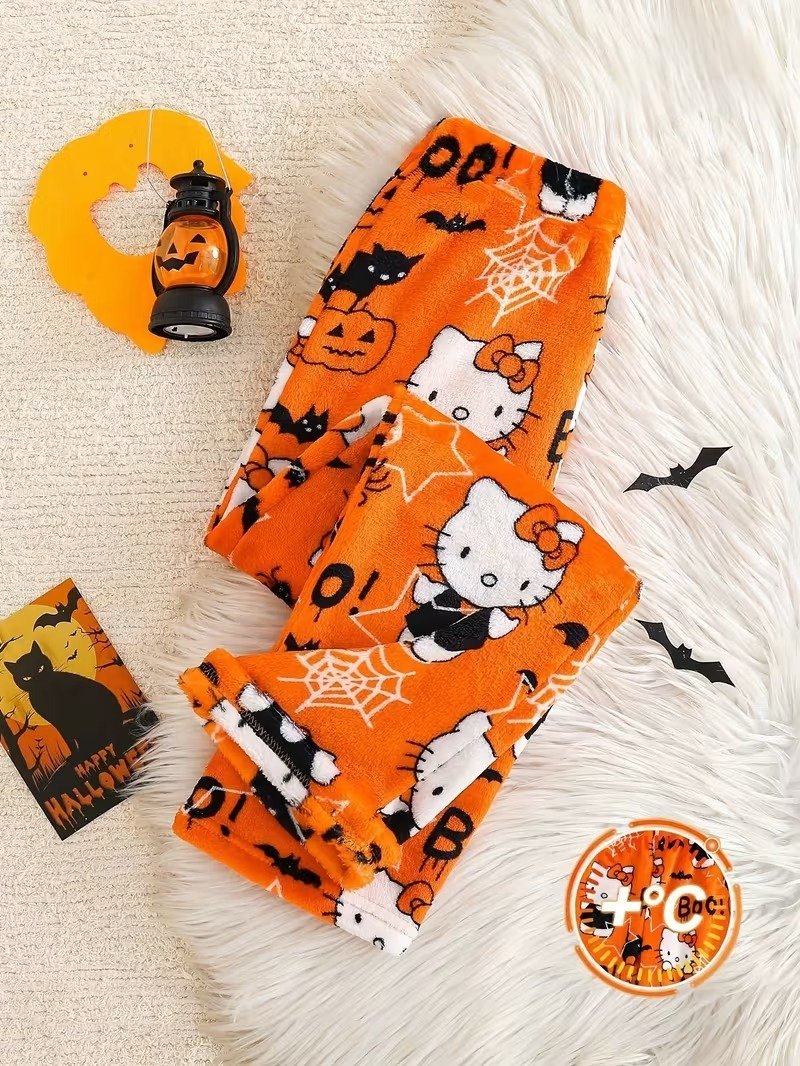 Perfect for October nights, watching scary movies, or handing out candy, these long sleep Pajamas are made from a Soft, Fuzzy Fleece material for cozy comfort. The vibrant Orange fabric features an exclusive, all-over Halloween pattern with Hello Kitty Pajama icons dressed up, alongside classic spooky elements like pumpkins, bats, spiderwebs, and the text “BOO!”. These Seasonal Loungewear Bottoms are essential for any festive fan!